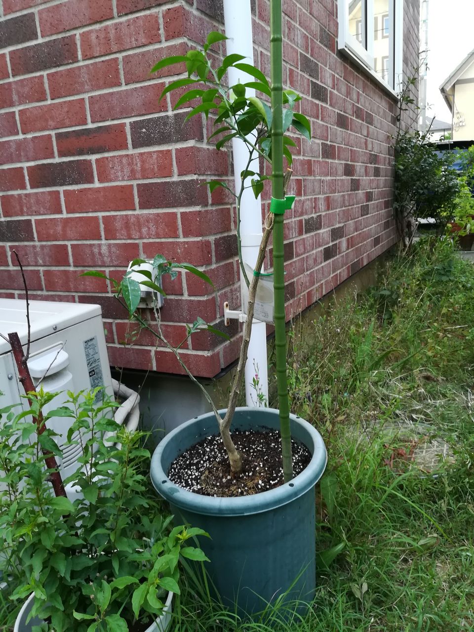 真夏の植え付けなのでちゃんと生育するか少し心配なのですが、柑橘は暑さに強いのでまあ大丈夫でしょう。