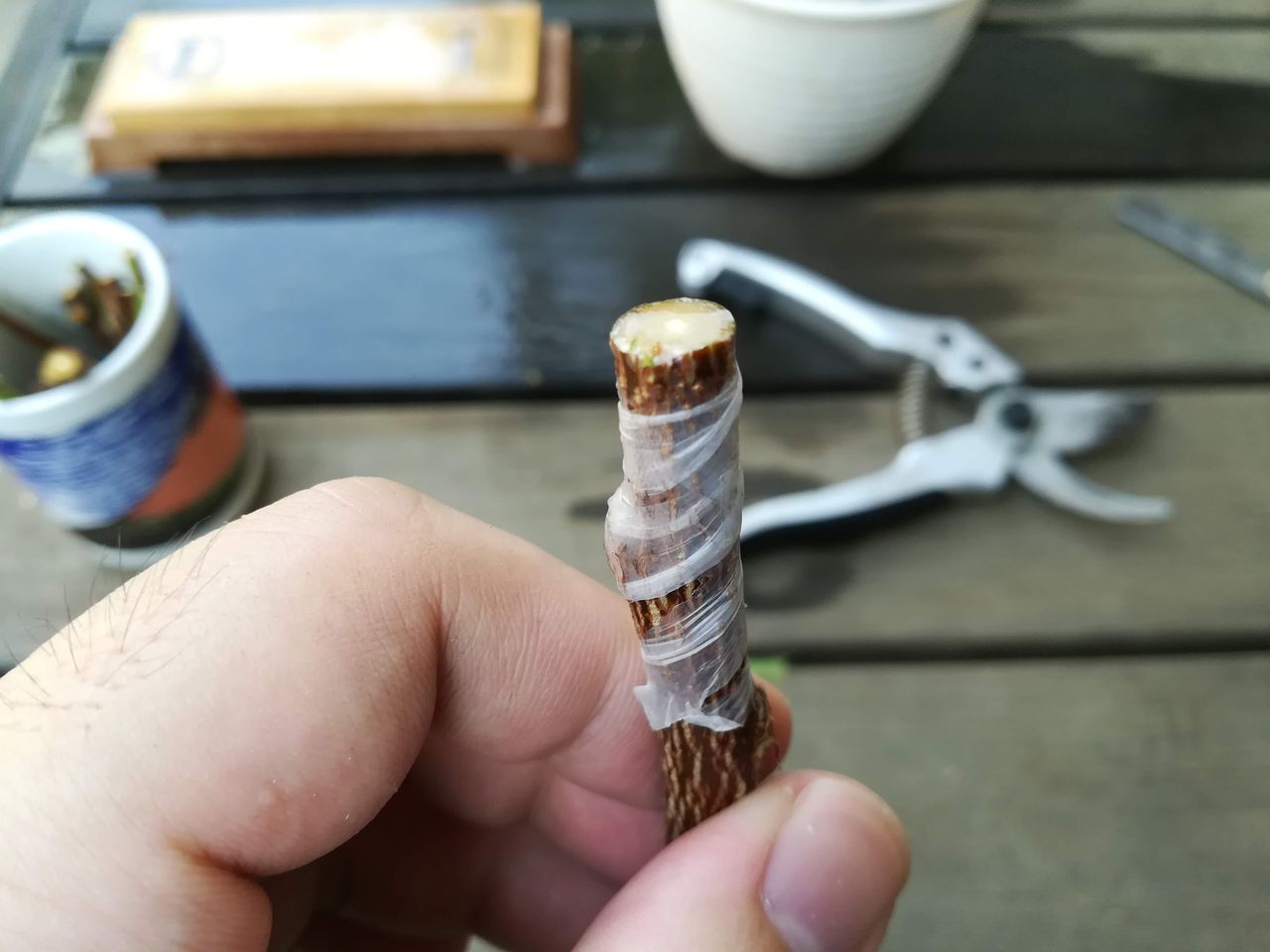 今回はなんとなく穂木の真ん中にテープが巻かれていない状態ですが、本などを読む限り、一般的には全体を隙間なくテープで巻くようです。というか私も今まではそれでやってきて成功しています。今回の「腹出し」がもしまずいやり方でこれで失敗するかどうかも注視していきたいと思っています(どちらでも良いのかもしれませんが)。