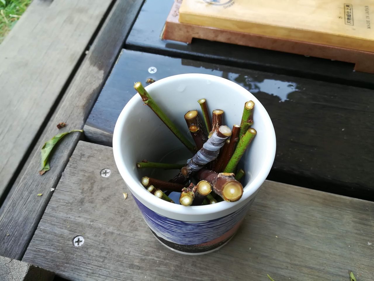 考えてみれば当たり前なのですが、この状態で接ぎ木をやってもつかないのでは?と考えとりあえずコップに水を入れてそこに切った穂木を挿して半日待って夕方に作業を始めることにしました。