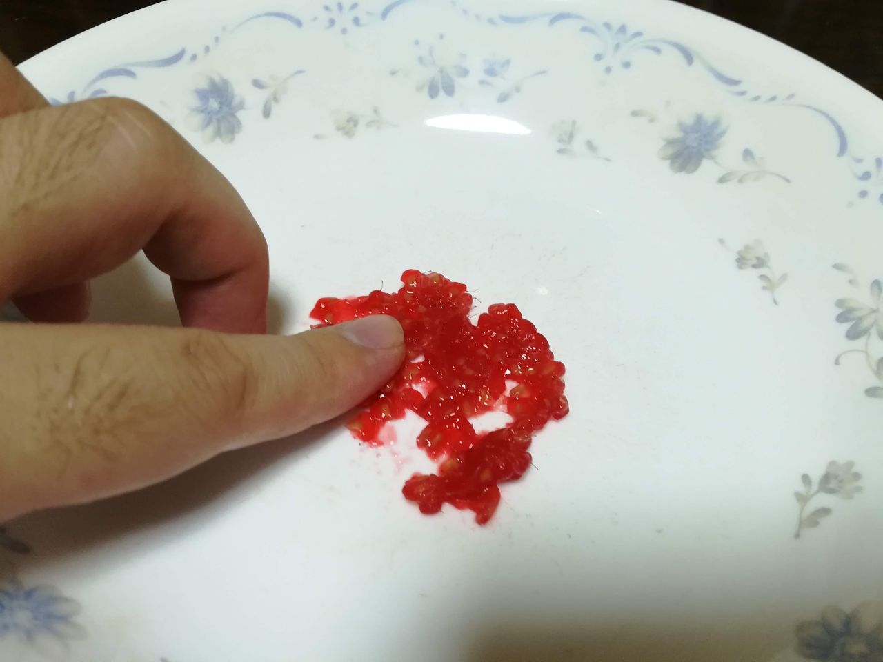 まず適当な平皿の上で実を潰してタネを取り出します。